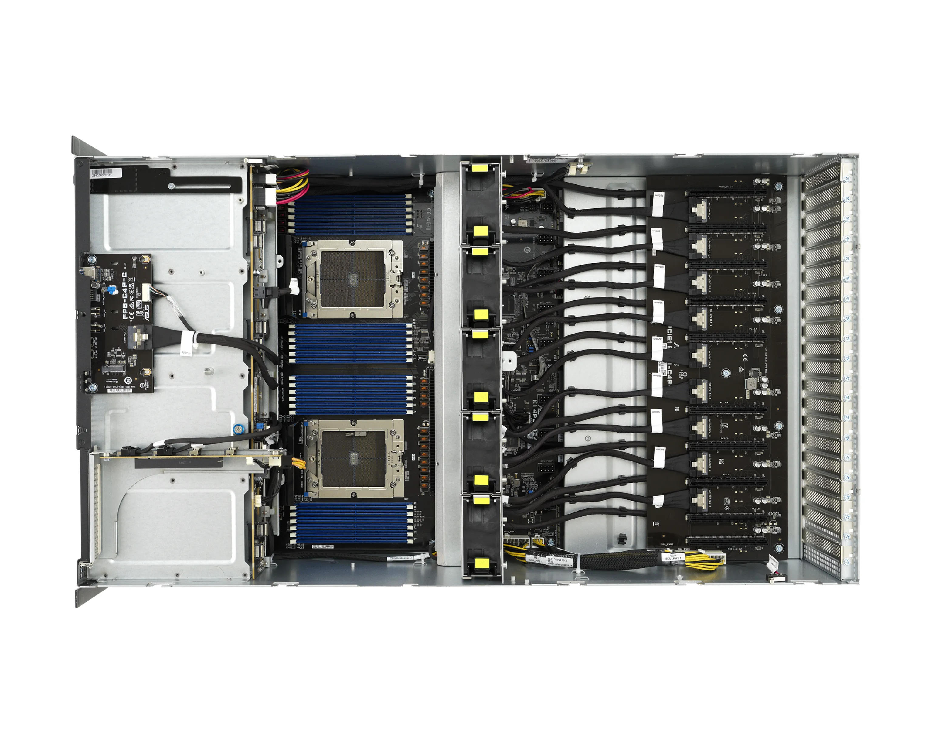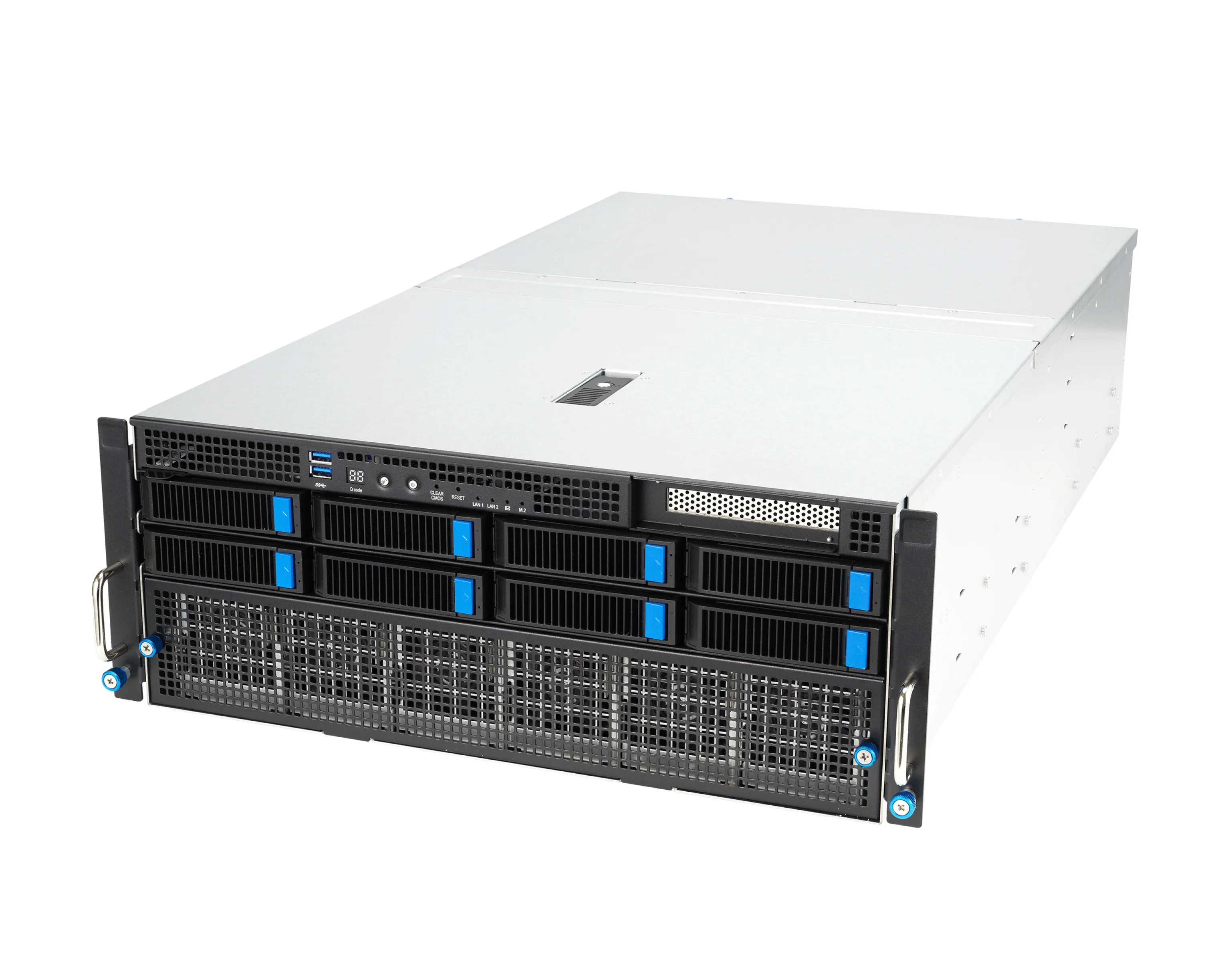 ASUS ESC8000A‑E12 — это 4U сервер с поддержкой двух процессоров AMD EPYC™ 9004 (с технологией 3D V‑Cache), рассчитанный на использование до восьми графических ускорителей (двойного слота). Он предназначен для инфраструктур с требованиями к AI, вычислениям высокой плотности, облакам и гиперконвергентным средам. Сервер готов к конфигурациям с жидкостным охлаждением и предлагает резервируемое питание, современное подключение PCIe 5.0 и высокие требования к безопасности.