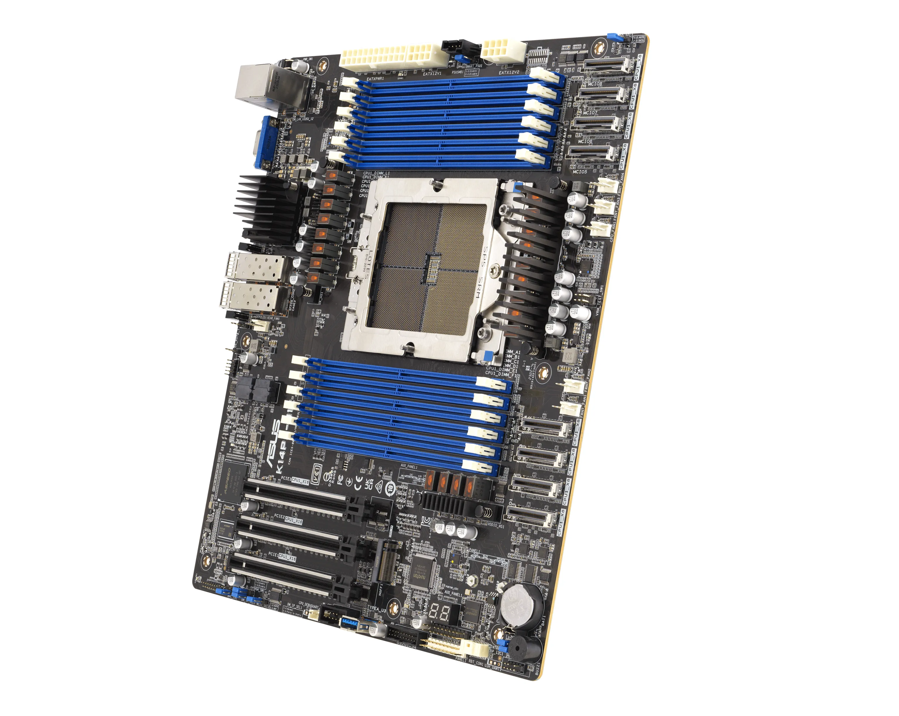 ASUS K14PA‑U12 — высокопроизводительная серверная плата формата SSI/CEB, предназначенная для использования с процессорами AMD EPYC 9004 серии. Плата рассчитана на задачи вычислений, хранения и расширения: поддерживает до 128 ядер, до 12 каналов памяти, широкие возможности подключения NVMe и слоты расширения. Встроенный модуль управления (iKVM / BMC) даёт полный контроль над системой.