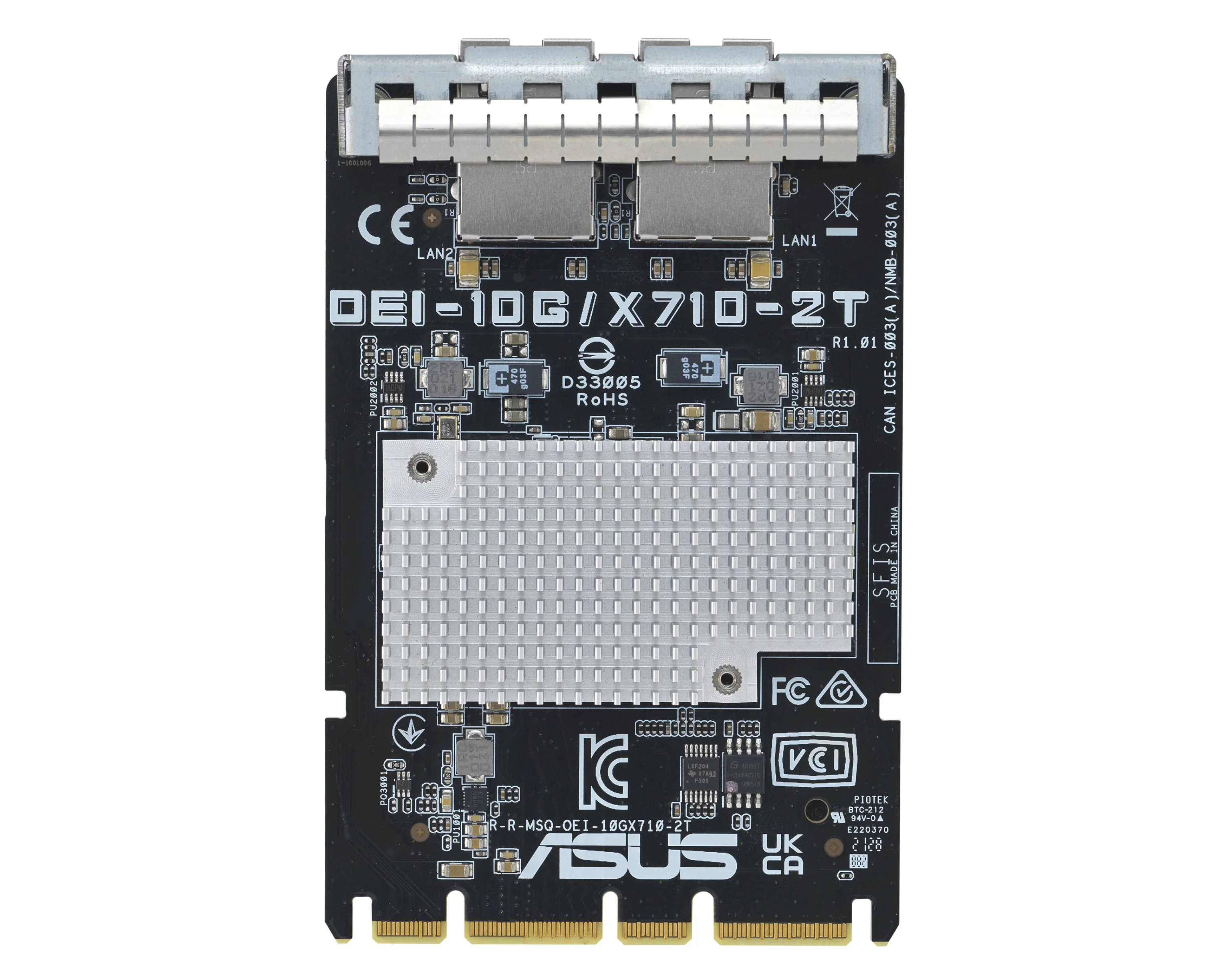 ASUS OEI‑10G/X710‑2T — это низкопрофильная сетевая карта формата OCP 3.0, оснащённая контроллером Intel X710‑AT2. Обеспечивает два порта 10 Гбит/с (RJ‑45), что делает её идеальной для использования в стойках, системах хранения, серверных платформах с поддержкой OCP. Благодаря компактному исполнению (Mezzanine / OCP интерфейс) она легко интегрируется в серверы, поддерживающие OCP модули.