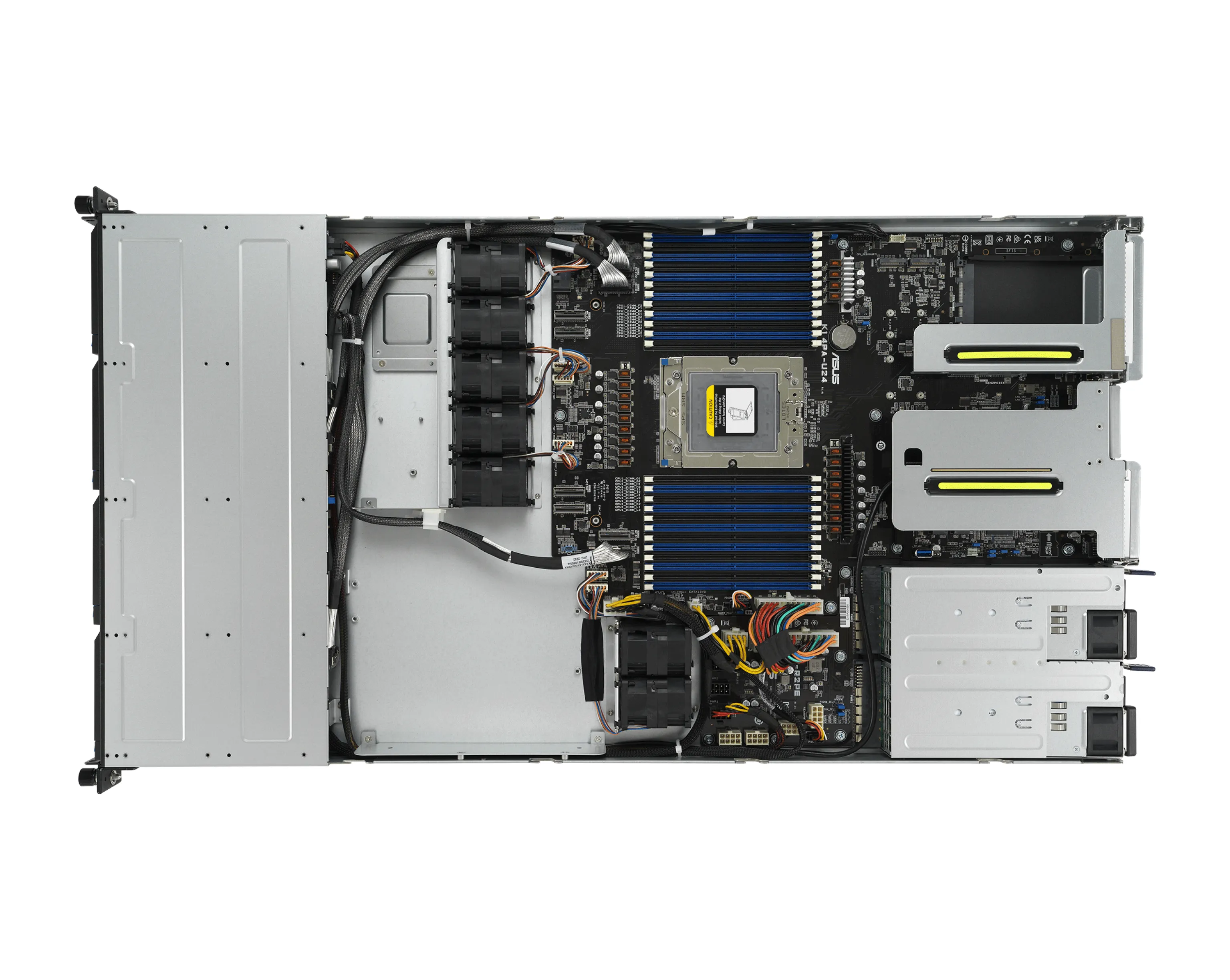 ASUS RS500A‑E12‑RS4U — это стоечный сервер формата 1U с одним процессором, предназначенный для задач хранения, вычислений, виртуализации и ускорения. Он обеспечивает поддержку до 24 слотов памяти DDR5, 4 hot‑swap NVMe / SATA / SAS дисков, расширение через PCIe Gen5 / OCP 3.0, возможность установки до двух однослотовых GPU и резервируемое питание. Это надёжное решение для инфраструктурных сред с ограниченным пространством.