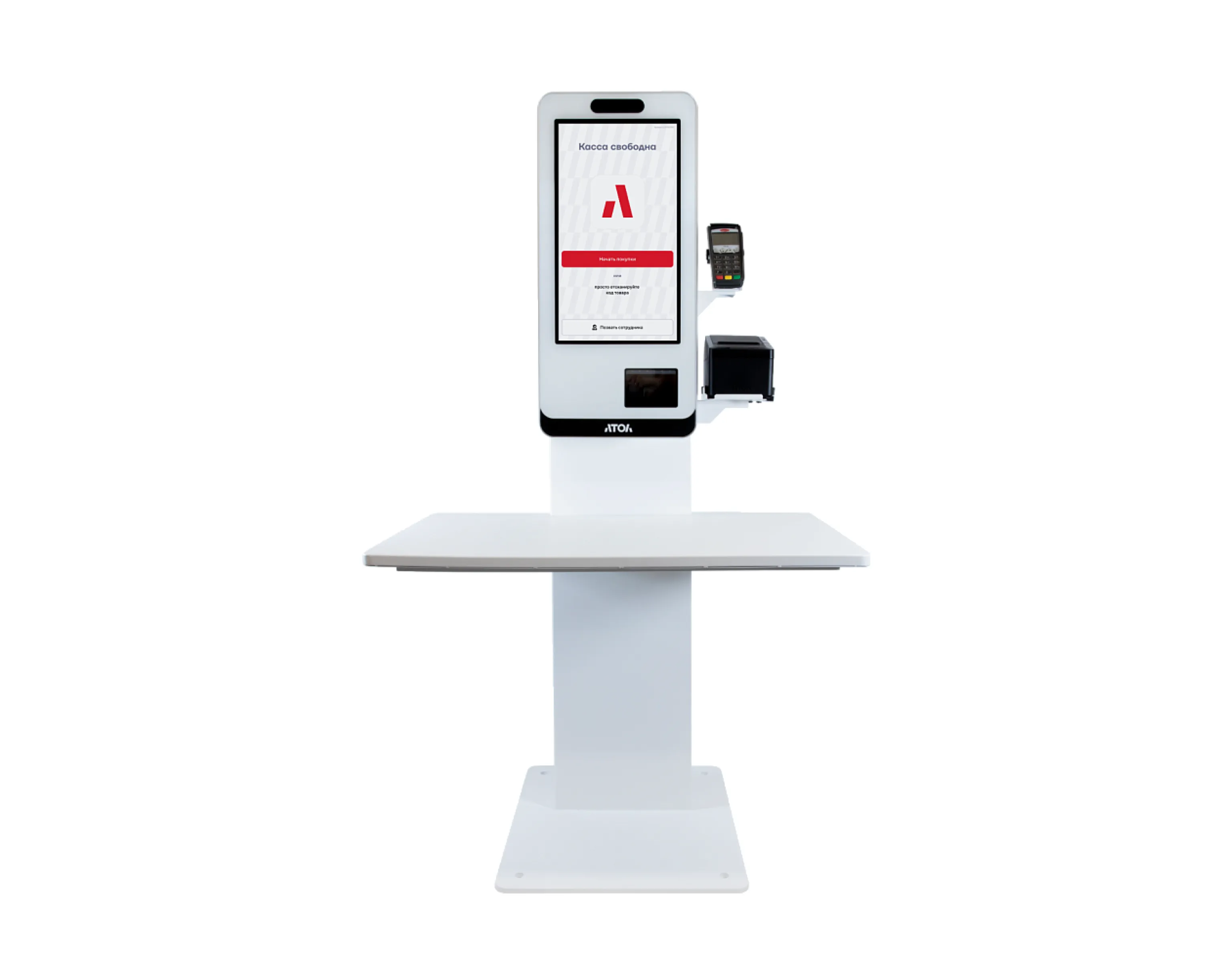Напольная стойка со столешницей для касс самообслуживания серии АТОЛ КСО 4xxx предназначена для удобного и эргономичного размещения оборудования в торговых залах. Она обеспечивает надежную фиксацию кассы и создает комфортные условия для покупателей при совершении покупок.