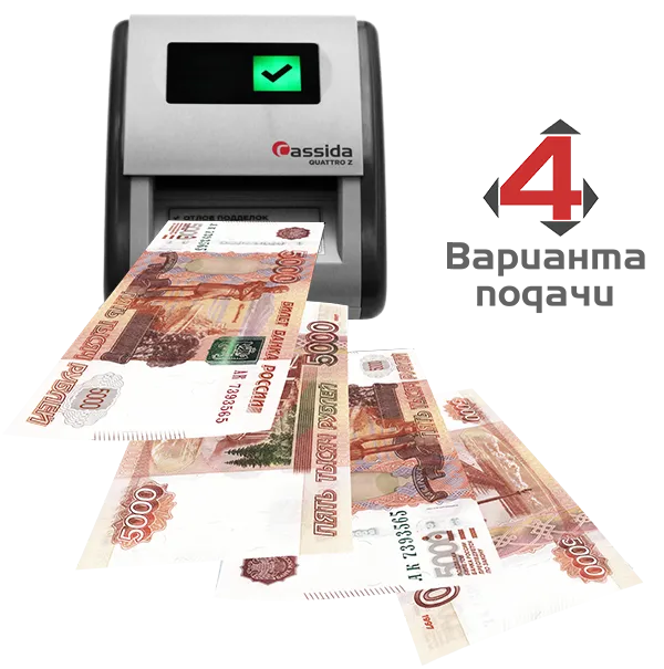 Cassida Quattro Z – удобная, экономичная и легкая в применении модель автоматического банкнотного детектора, использующая элементарный режим уведомлений-индикаторов «да – нет». Для управления устройством не требуется никаких специализированных навыков, аппарат обладает интуитивно понятным интерфейсом, его экран располагает всего двумя индикаторами – красным и зеленым, они и выводят сообщение о результатах проверки банкноты, как такового, традиционного и привычного дисплея у детектора не имеется. Данная модификация не предусматривает наличие аккумуляторной батареи, в качестве источника питания выступает AC/DC-адаптер, а аккумулятором можно дооснастить по желанию (опционально). Также распознает купюры номиналом в 200 и 2000 рублей.