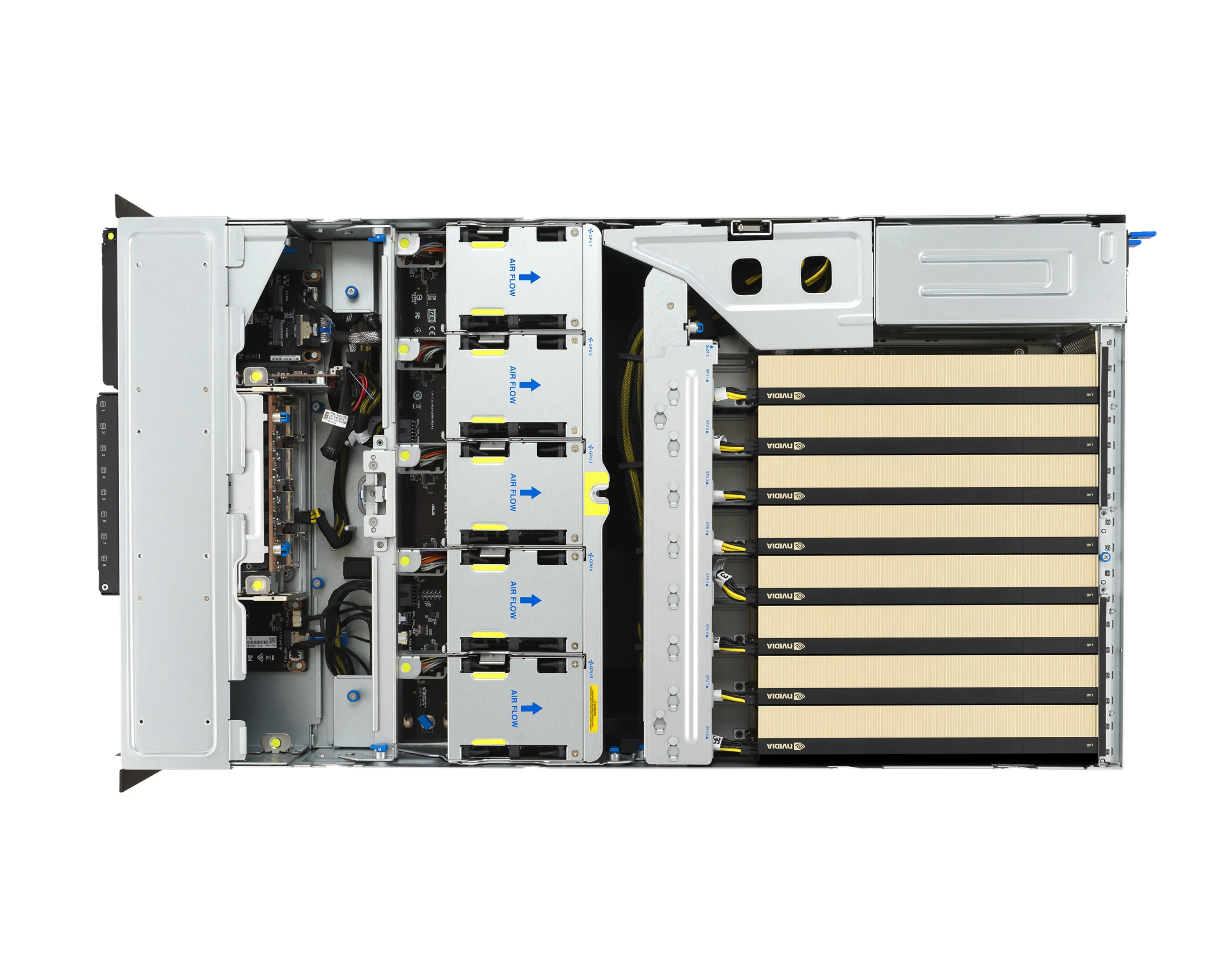 - Размещение до 8 двухслотовых GPU (активных или пассивных) с возможностью использования NVIDIA NVLink мостов