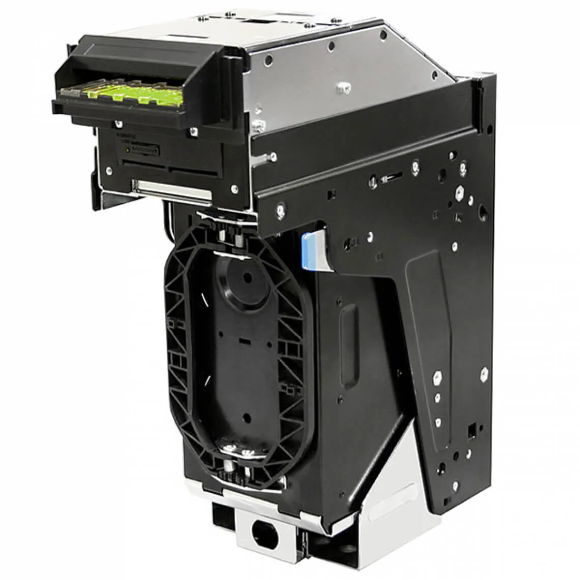 Любая модель купюроприемника должна иметь в своем составе кассету, которая обеспечивает бережную укладку и сохранность наличности, поступающей в платежное оборудование. Данная модель кассеты разработана специально для купюроприемника марки CashCode MFL и может вмещать в себя до 1 тыс. банкнот (это ее максимальная емкость). Благодаря точной совместимости кассеты с устройством, обеспечивается его бессбойная и корректная работа. Изъятие кассеты осуществляется с той же стороны, где происходит и прием купюр.