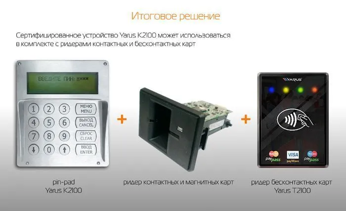 PIN-клавиатура серии YARUS K2100 является полнофункциональным, вандалоустойчивым пин-падом, применяющимся на улицах. В аппарат встроены внешние картридеры для возможности оплаты по картам. Пин-пад данной модели являет собой портативную контрольно-кассовую машину с защищенной электронной контрольной лентой (ЭКЛЗ). При подключении к платежному терминалу, устройство способно принимать оплату, как при помощи наличных, так и различных карт (бесконтактных, магнитных, чипированных). Внедренные 3G и GPRS-модули, наличие фискальной памяти делают устройство современным и соответствующим всем необходимым стандартным параметрам, поэтому оно внесено в государственный реестр ККМ.