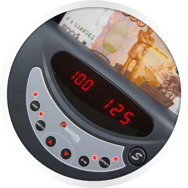 Представленная модель счетчика банкнот Cassida Tiger I/IR способна распознавать фальшивые банкноты российских рублей номиналами в 1000 и 5000 рублей. Внедрение самых инновационных технологий детекции позволяет исключить ошибки в процессе пересчета денежных купюр и выявления фальшивых единиц. Также распознает купюры номиналом в 200 и 2000 рублей.