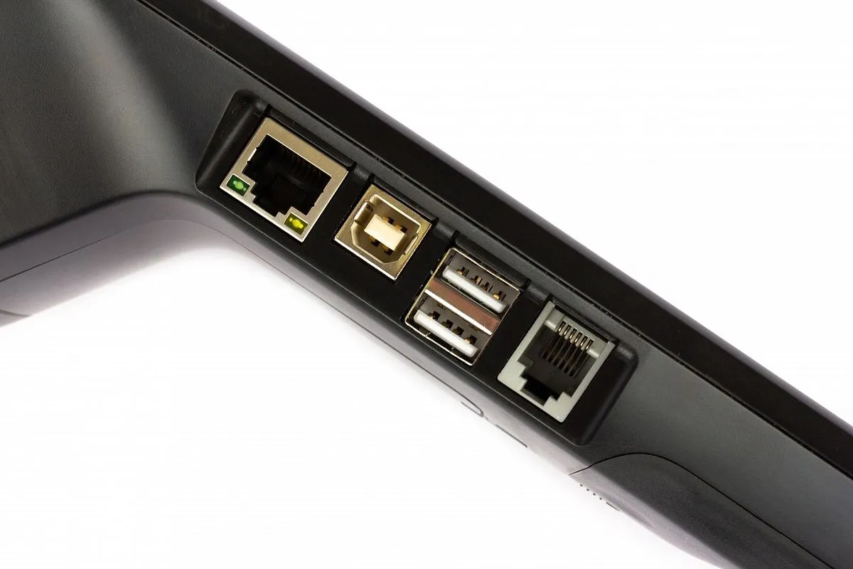 Смарт-терминал может осуществлять коннект со сканерами ШК, цифровыми весами, клавиатурами, криптографическими ключами, ПК. Порты расположены с двух сторон кассы, основная панель с ними – с левого бока. Обеспечение плотного контакта и супернадежного крепления не позволит гнездам расшатываться в течение всего эксплуатационного срока. Возможно и одновременное подключение сразу всех портов. Такой тип конструкции способствует повышению комфортабельности использования кассы с подсоединенными разнообразными внешними устройствами.