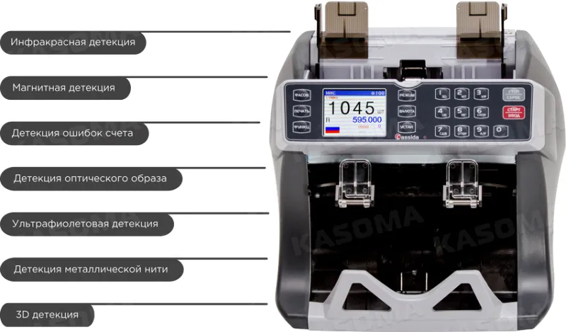 Детекция водяных знаков ИК. Детекция металлической нити МГ. Детекция ультрафиолета УФ. Детекция скотча. Детекция видимого образа. Детекция по оптической плотности. |