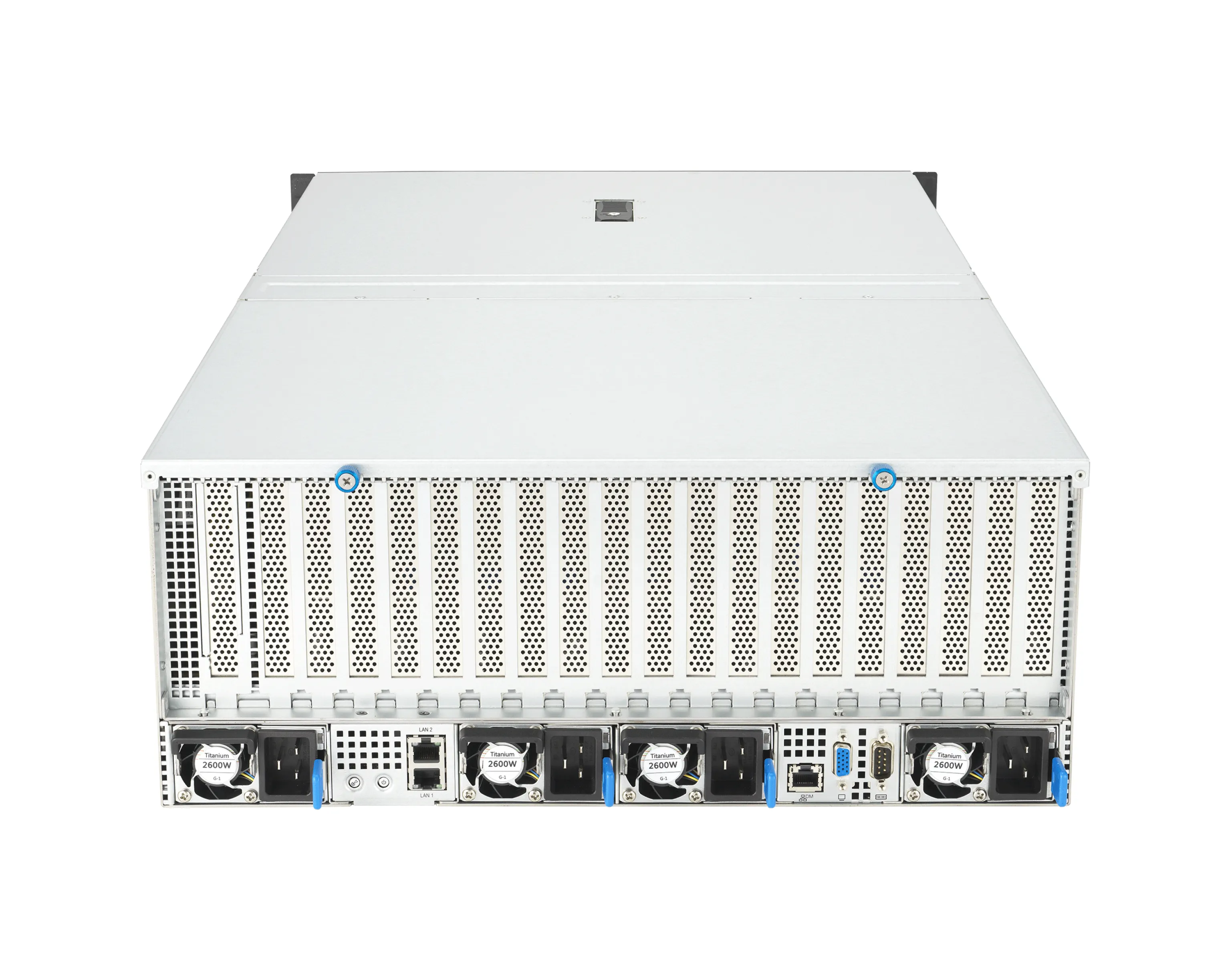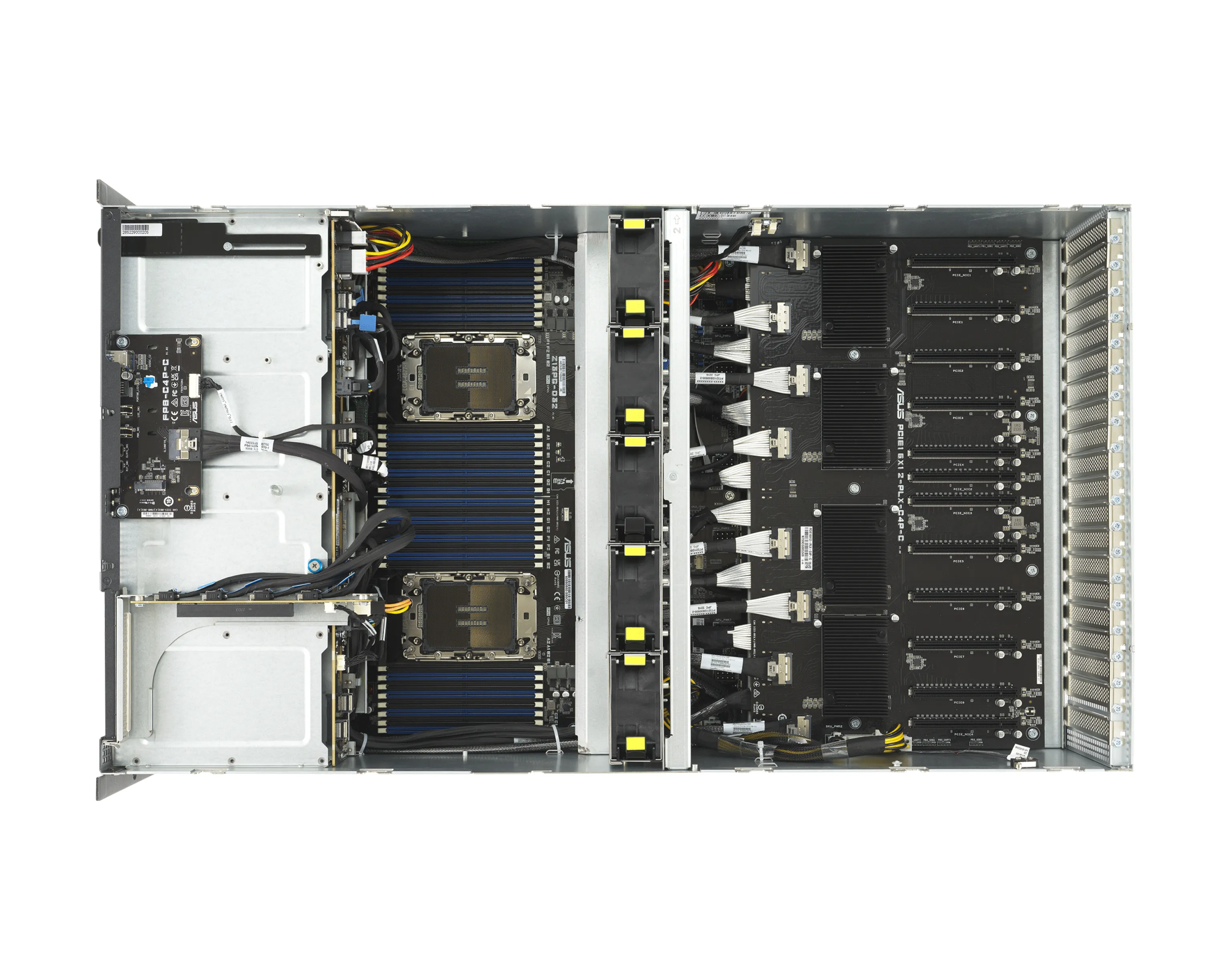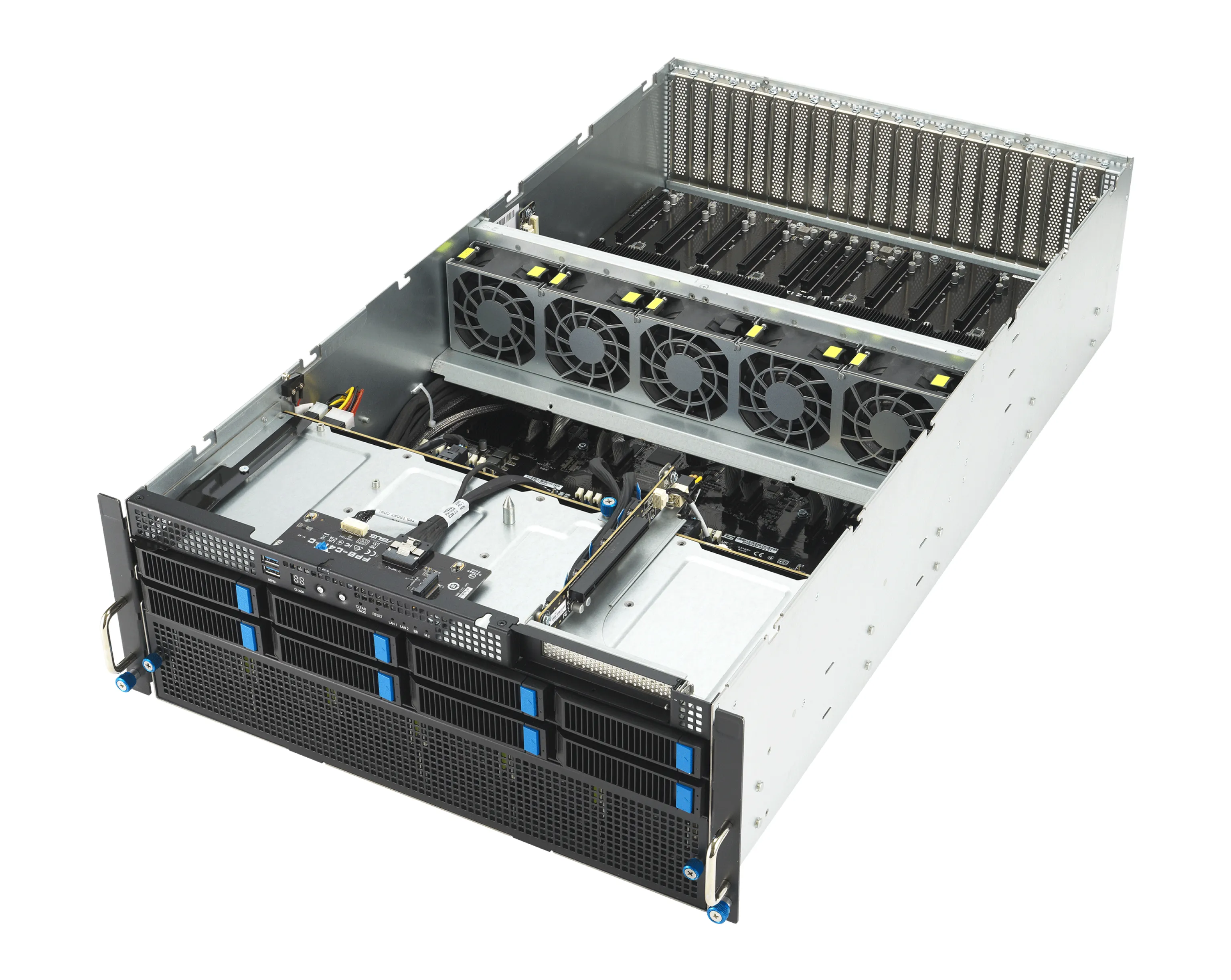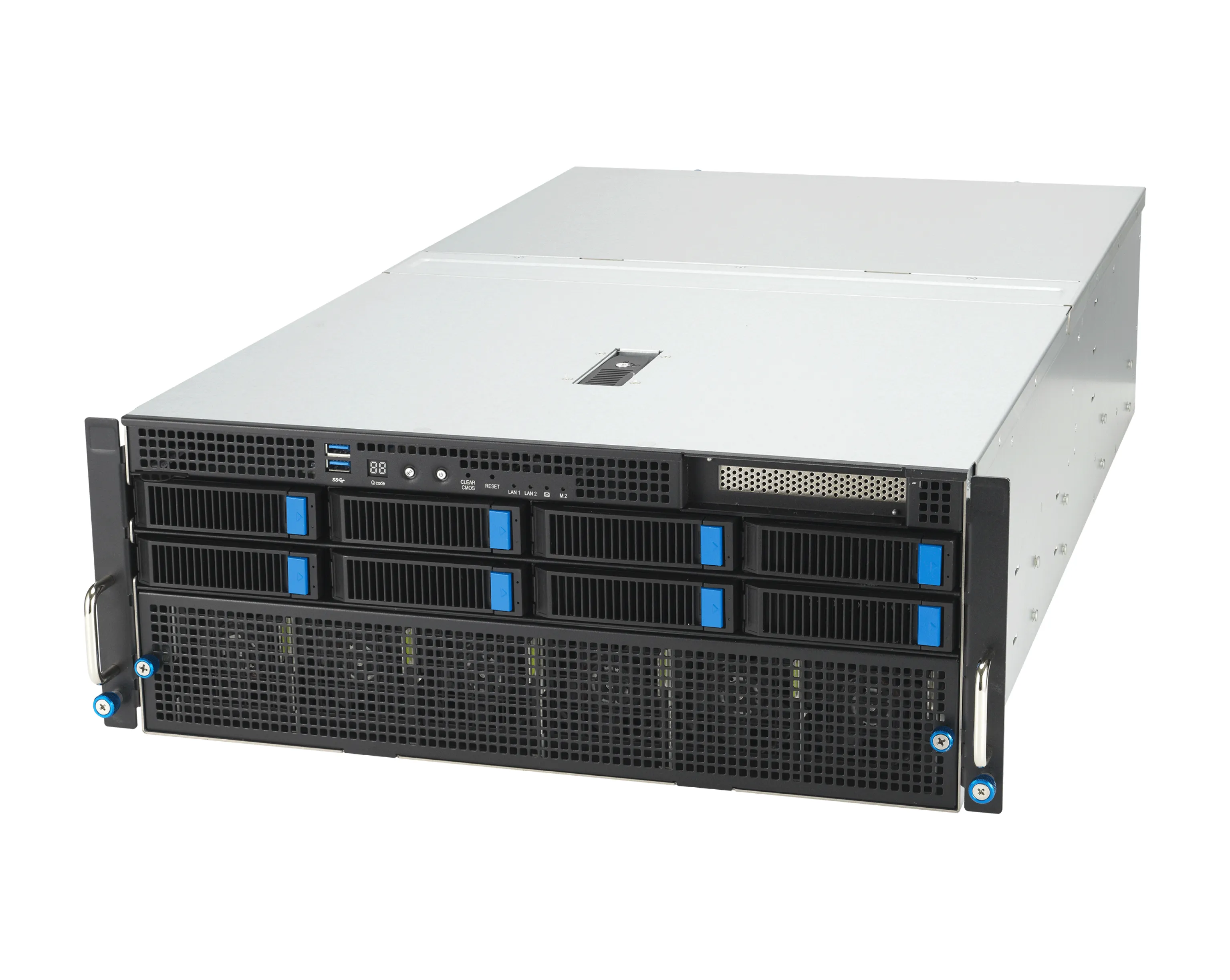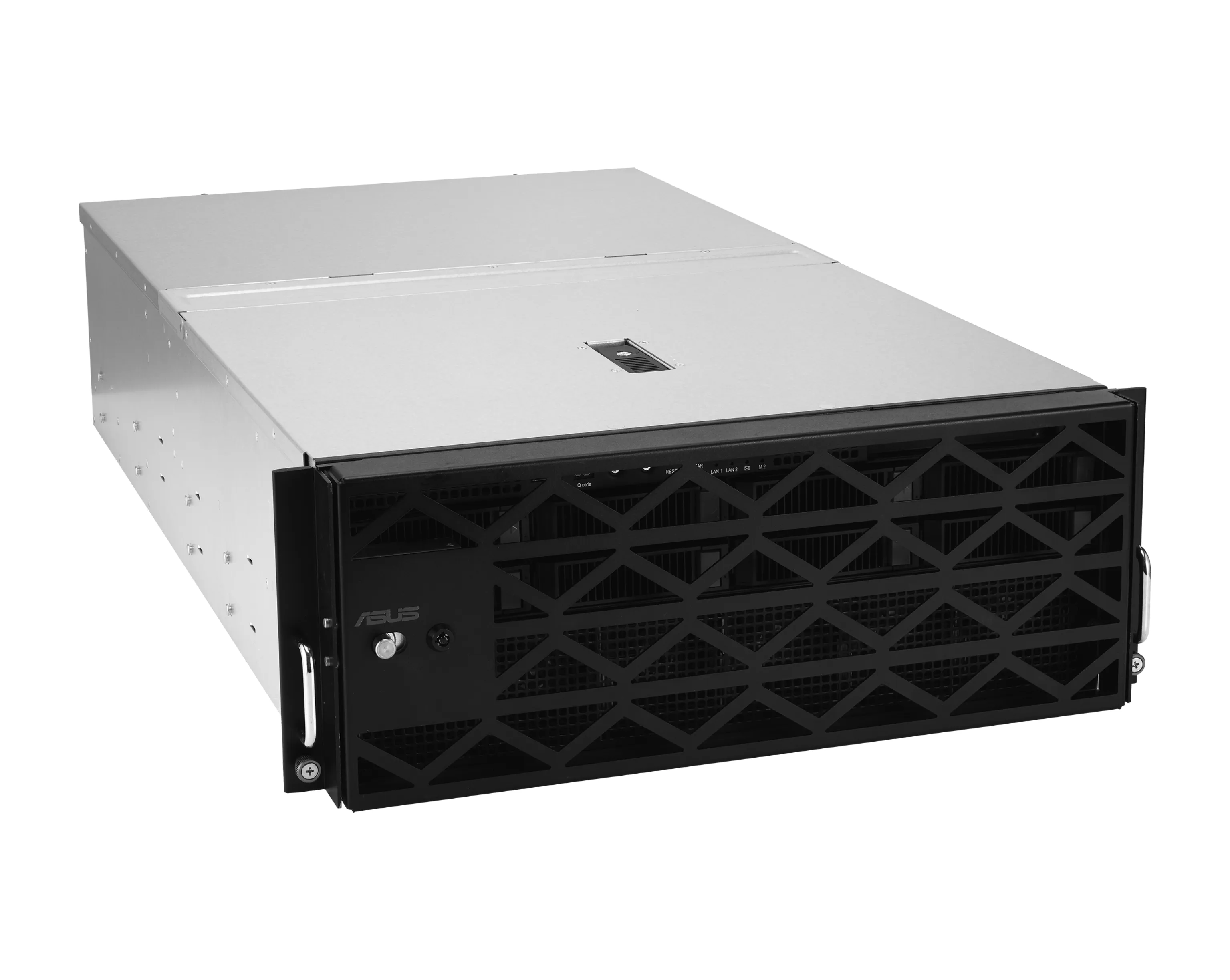 ASUS ESC8000‑E11P — это сервер в корпусе 4U с поддержкой двух процессоров (dual‑socket), специально спроектированный для задач ИИ, высокопроизводительных вычислений (HPC) и масштабируемых GPU‑инфраструктур. Он поддерживает до восьми графических ускорителей (GPU) в двухслотовом исполнении, решение с переключателем PCIe 5.0, множество слотов расширения и надёжное питание с резервированием.