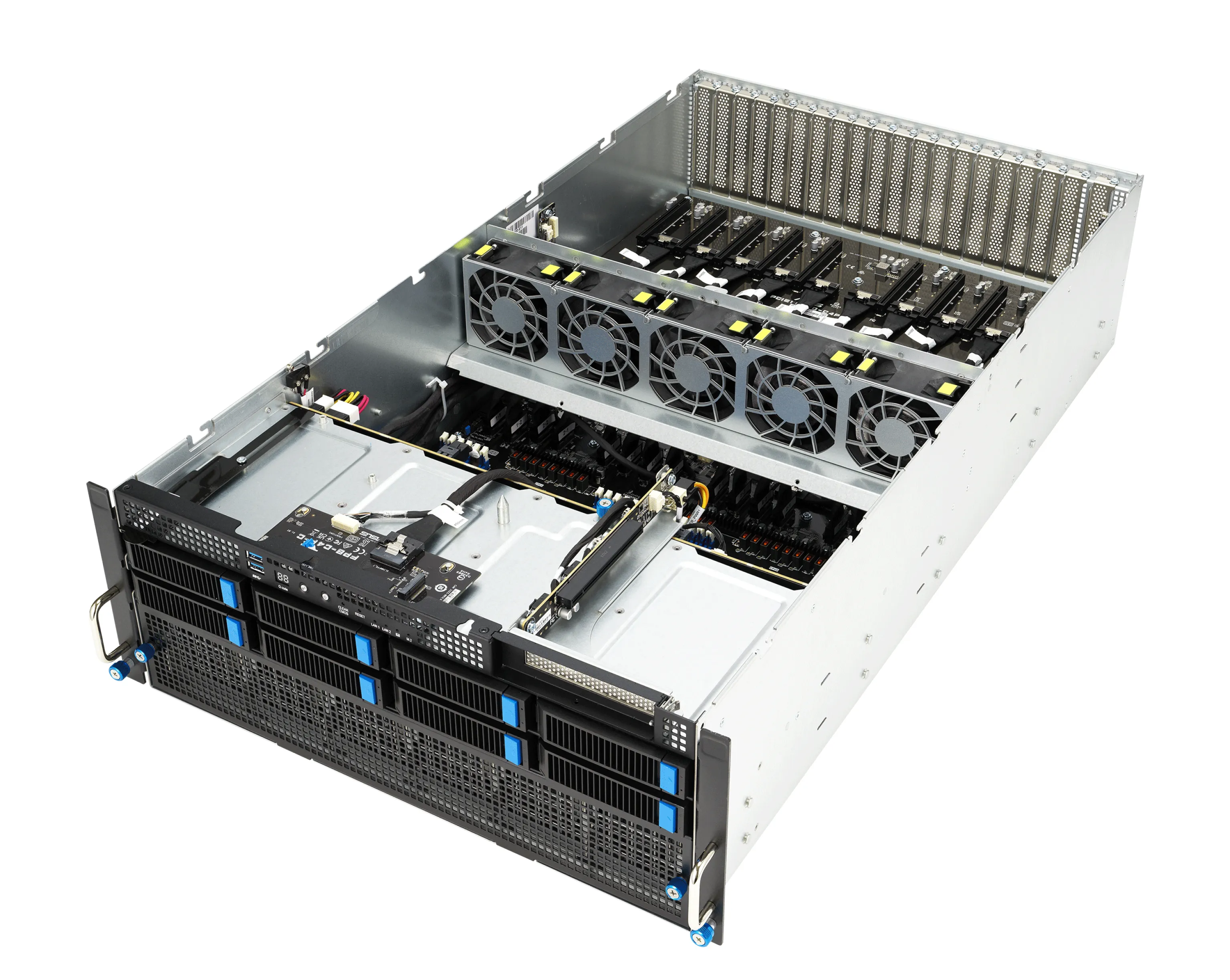 - Слоты расширения: в общей сложности 11 слотов — 8 × PCIe Gen5 x16 (для GPU), 1 × PCIe x16 (NIC), 1 × PCIe x8 (для HBA/RAID), и 1 × PCIe x8 / OCP 3.0 для сетевых карт.