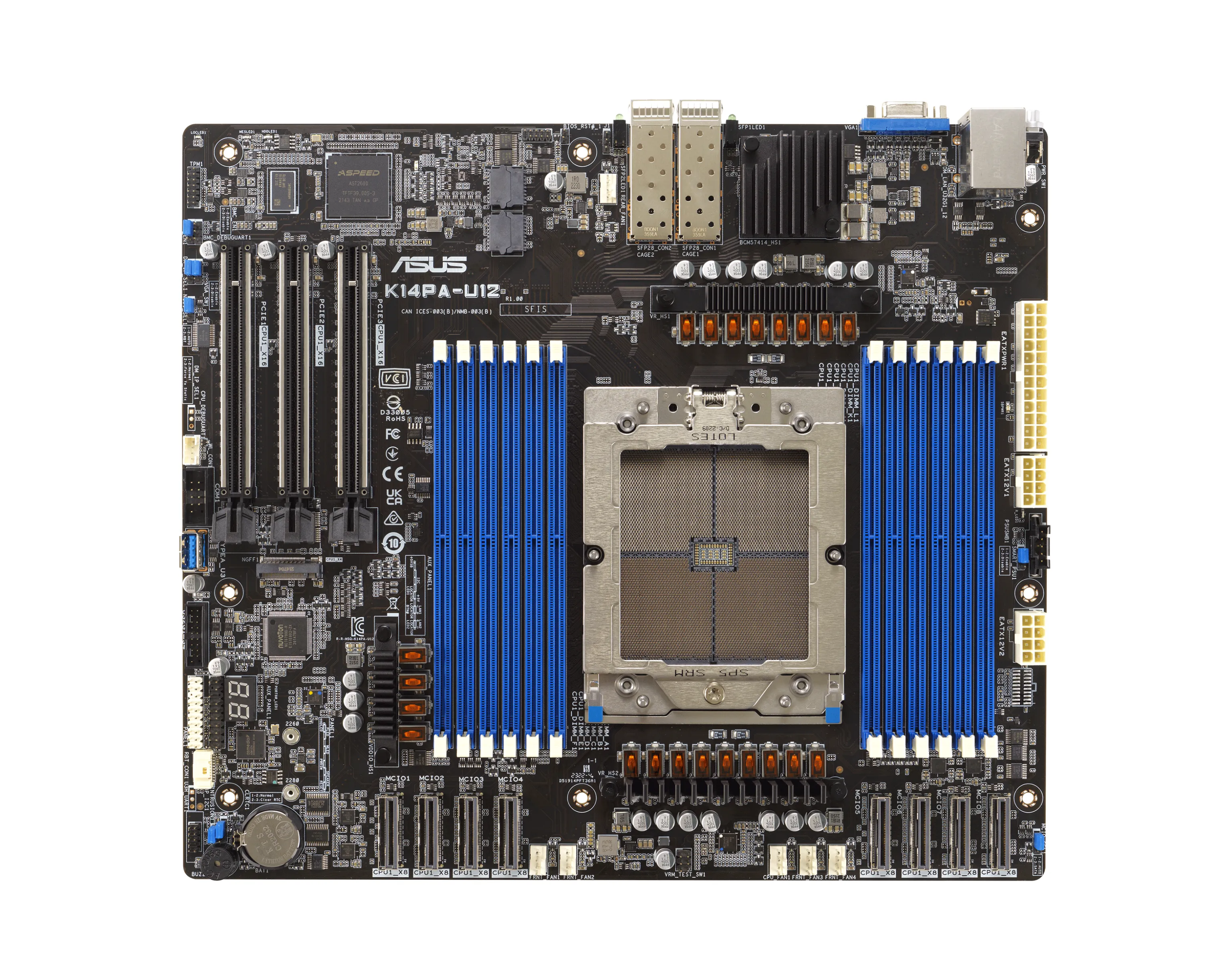 ASUS K14PA‑U12 — высокопроизводительная серверная плата формата SSI/CEB, предназначенная для использования с процессорами AMD EPYC 9004 серии. Плата рассчитана на задачи вычислений, хранения и расширения: поддерживает до 128 ядер, до 12 каналов памяти, широкие возможности подключения NVMe и слоты расширения. Встроенный модуль управления (iKVM / BMC) даёт полный контроль над системой.