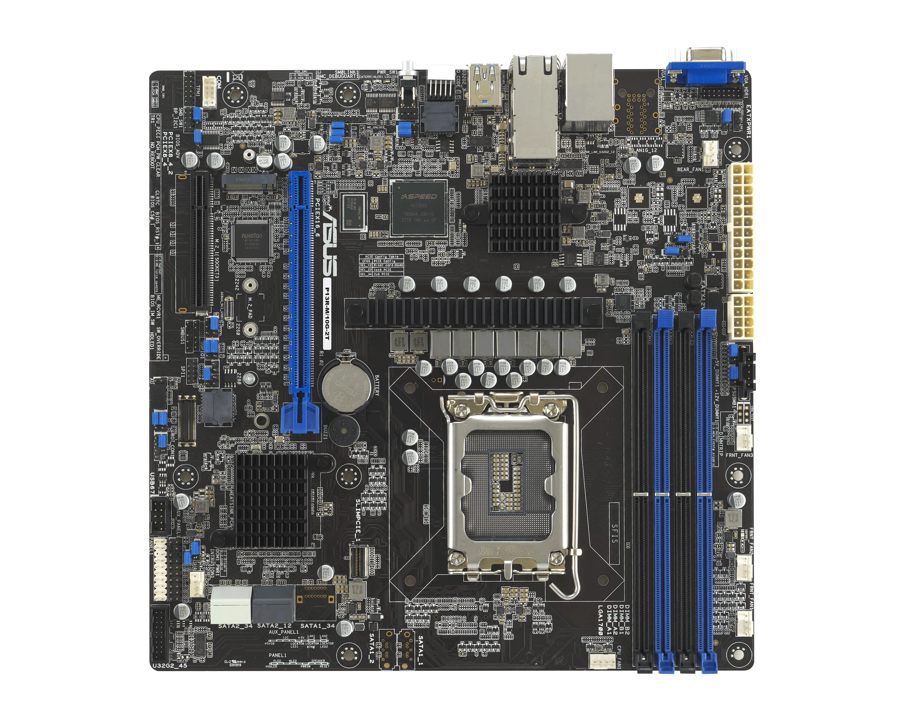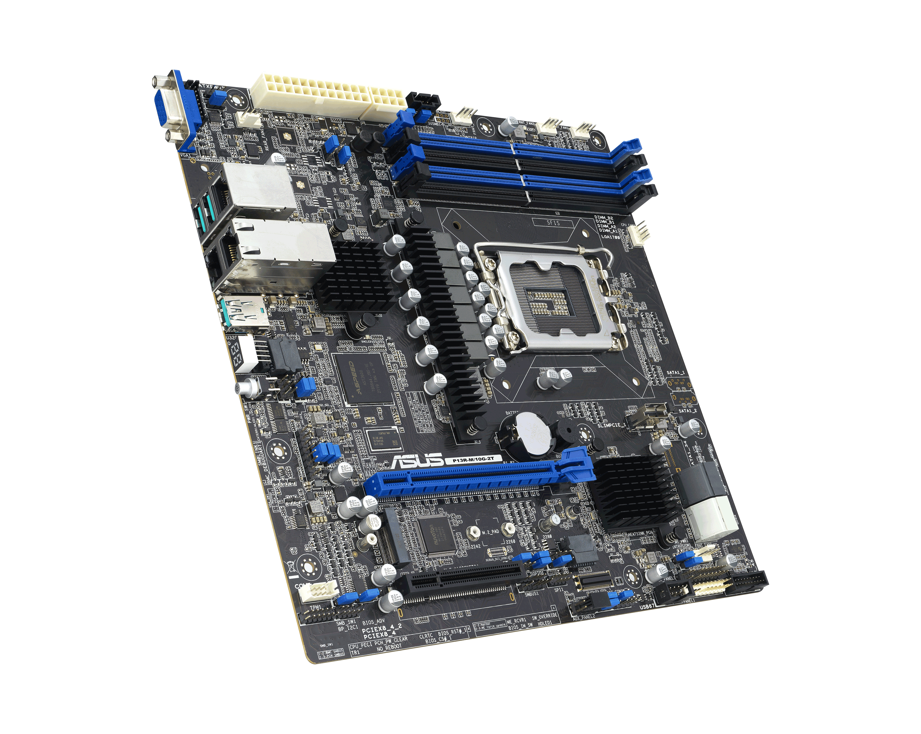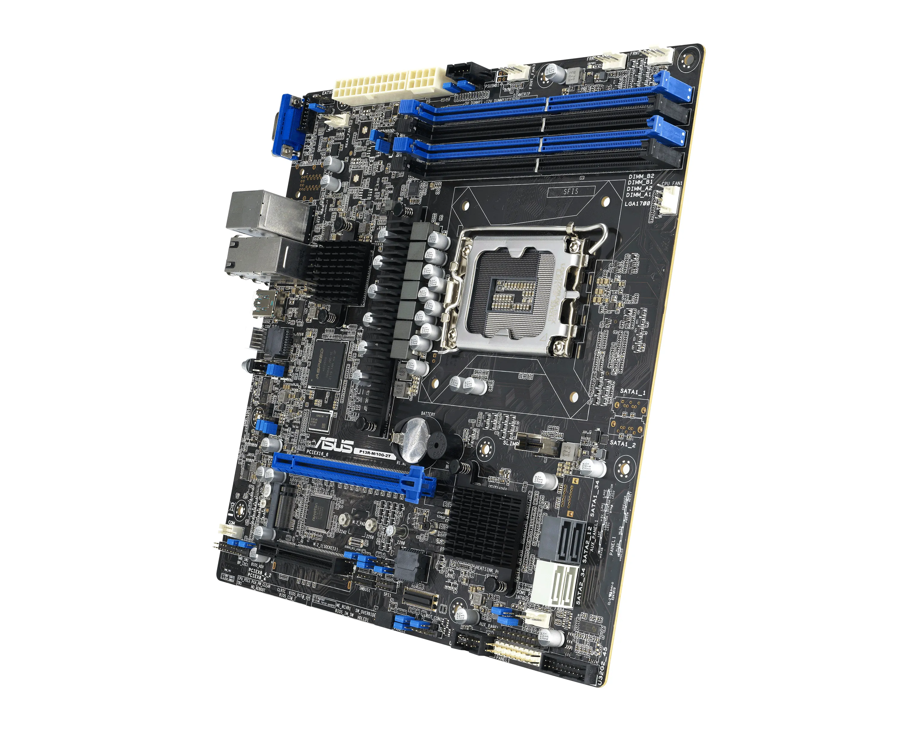 ASUS P13R‑M/10G‑2T — это компактная и функциональная серверная плата формата micro‑ATX, рассчитанная для использования в компактных серверах и узлах обработки данных. Она поддерживает процессоры Intel Xeon E‑2400 и Xeon 6300, имеет два встроенных порта 10Гбит LAN, расширенные интерфейсы PCIe (включая PCIe 5.0), четыре слота памяти DDR5 ECC и встроенный модуль удалённого управления (iKVM / BMC).